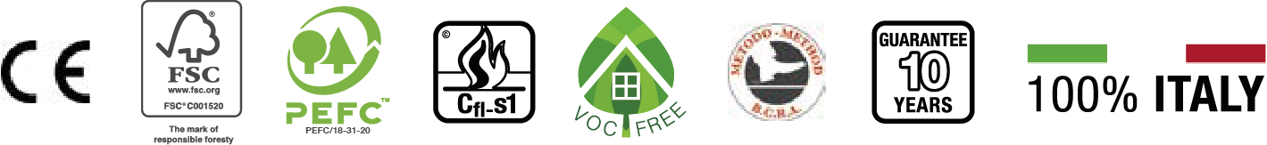 Materiale trattato con vernice Acrilica ad effetto opaco. Tutte le finiture, hanno l’aggiunta di una vernice protettiva trasparente contenente particelle agli ioni d’argento che crea una barriera naturale e duratura contro i nemici dell’igiene.